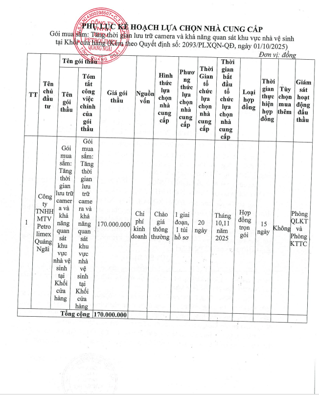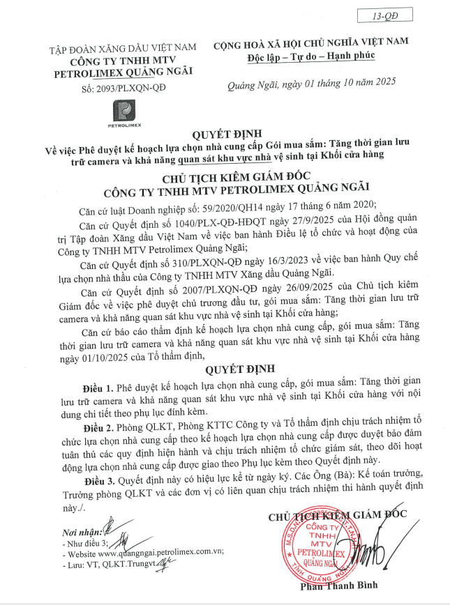 Quyết định phê duyệt kế hoạch lựa chọn nhà cung cấp tăng thời gian lưu trữ camera và khả năng quan sát khu vực nhà vệ sinh tại Khối cửa hàng
