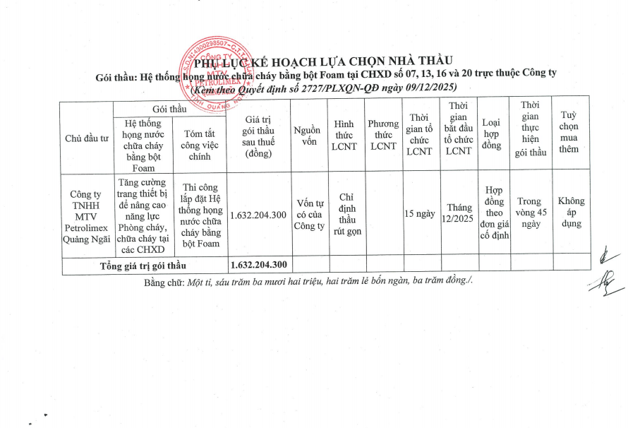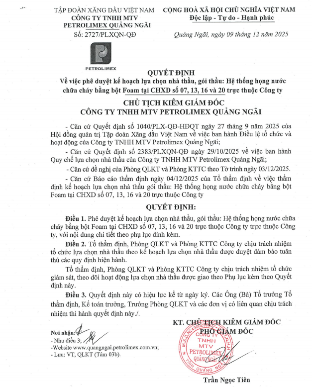 Quyết định phê duyệt kế hoạch lựa chọn nhà thầu Hệ thống họng nước chữa cháy bằng bột Foam tại CHXD số 7, số 13, số 16 và số 20 trực thuộc Công ty