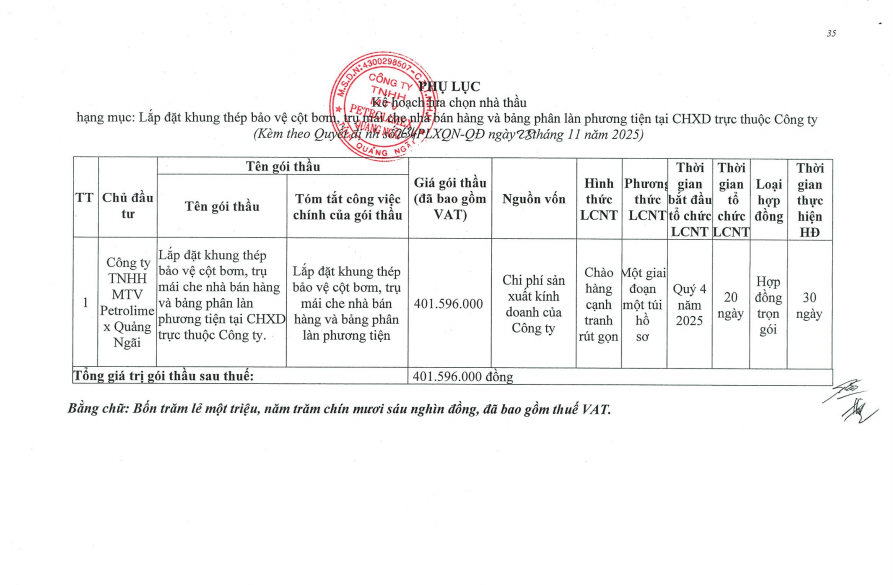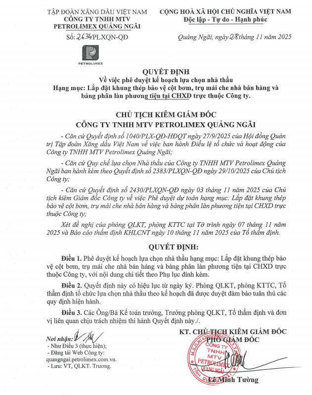 Quyết định phê duyệt kế hoạch lựa chọn nhà thầu lắp đặt khung thép bảo vệ cột bơm và một số hạng mục khác tại các CHXD trực thuộc Công ty