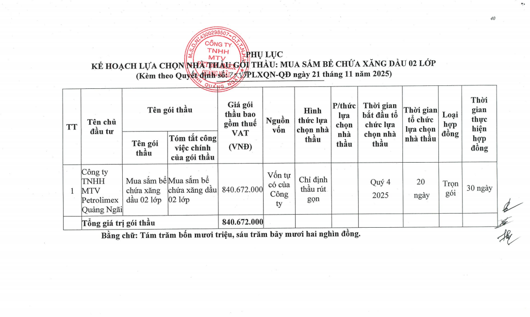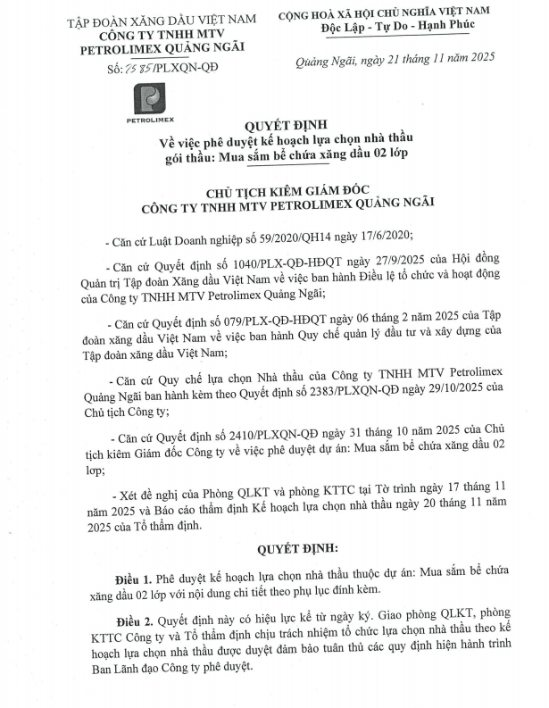 Quyết định phê duyệt kế hoạch lựa chọn nhà thầu mua sắm bể chứa xăng dầu 02 lớp