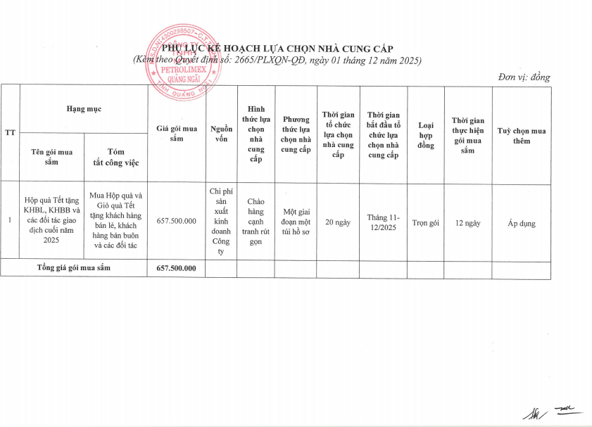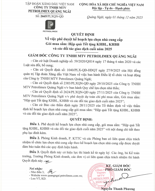 Quyết định phê duyệt kế hoạch lựa chọn nhà cung cấp họp quà Tết tặng KHBL, KHBB và các đối tác giao dịch cuối năm 2025