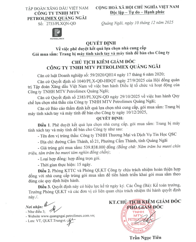Quyết định phê duyệt kết quả lựa chọn nhà cung cấp trang bị máy tính xách tay và máy tính để bàn cho Công ty