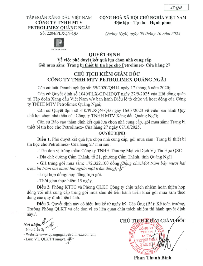 Quyết định phê duyệt kết quả lựa chọn nhà cung cấp trang bị thiết bị tin học cho Petrolimex - Cửa hàng 27