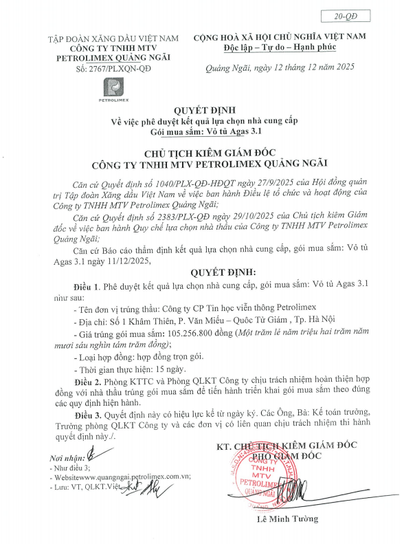 Quyết định phê duyệt kết quả lựa chọn nhà cung cấp vỏ tủ Agas 3.1