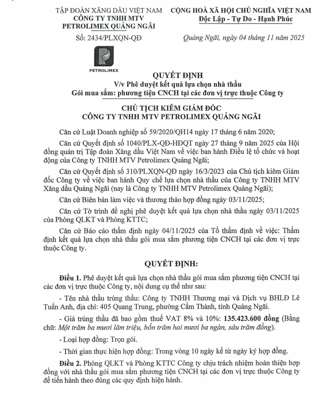 Quyết định phê duyệt kết quả lựa chọn nhà thầu mua sắm phương tiện CNCH tại các đơn vị trực thuộc Công ty