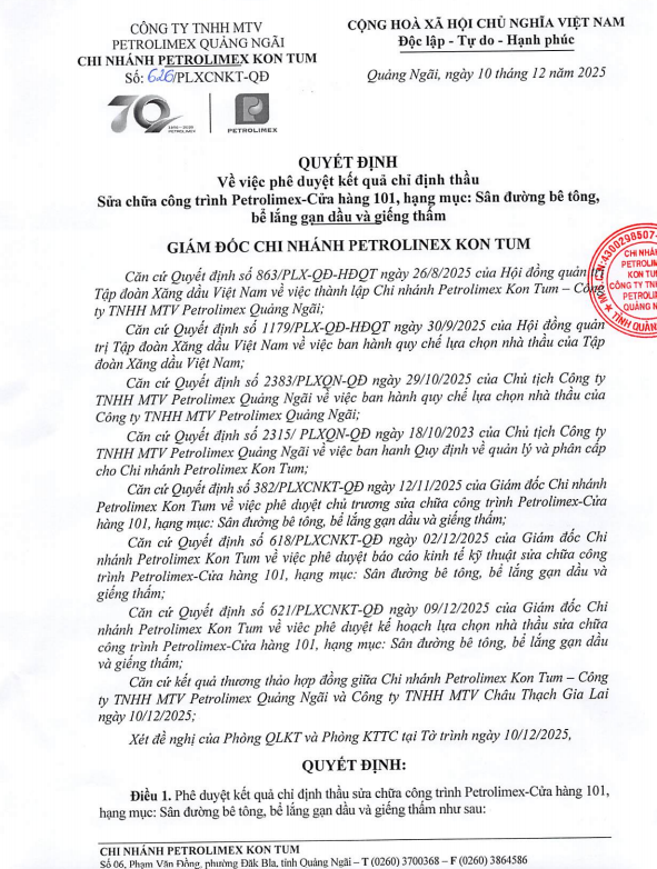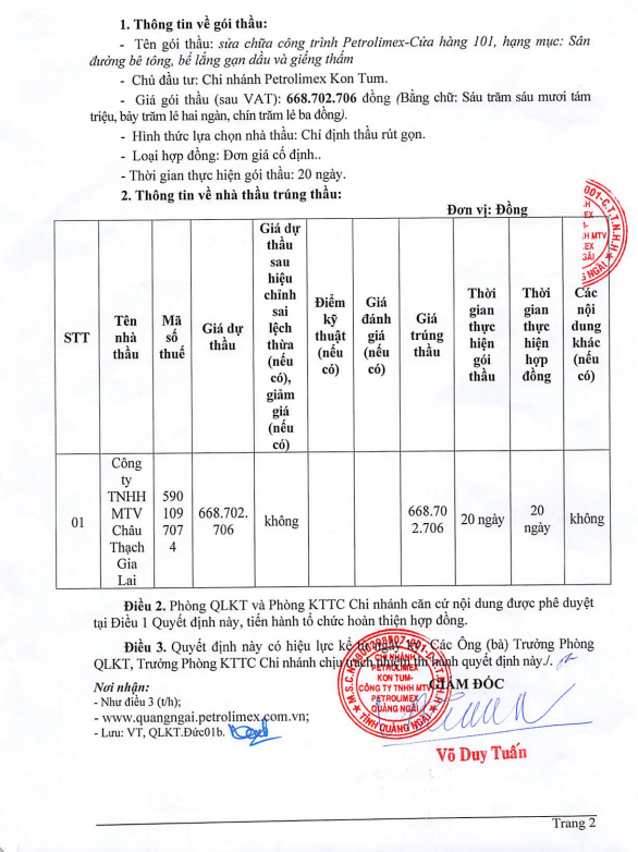 Quyết định phê duyệt kết quả chỉ định thầu thi công sửa chữa một số hạng mục tại Petrolimex-Cửa hàng 101