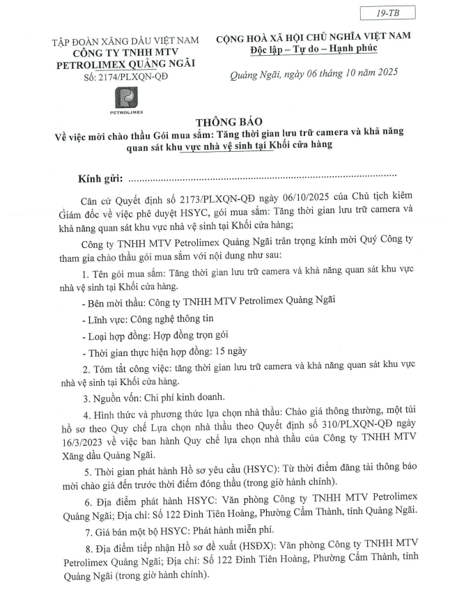 Thông báo kết quả lựa chọn nhà cung cấp trang bị cờ ngành Petrolimex, cờ Tổ quốc, cờ phướn cho Khối CHXD và TNNQ đợt 2 năm 2025