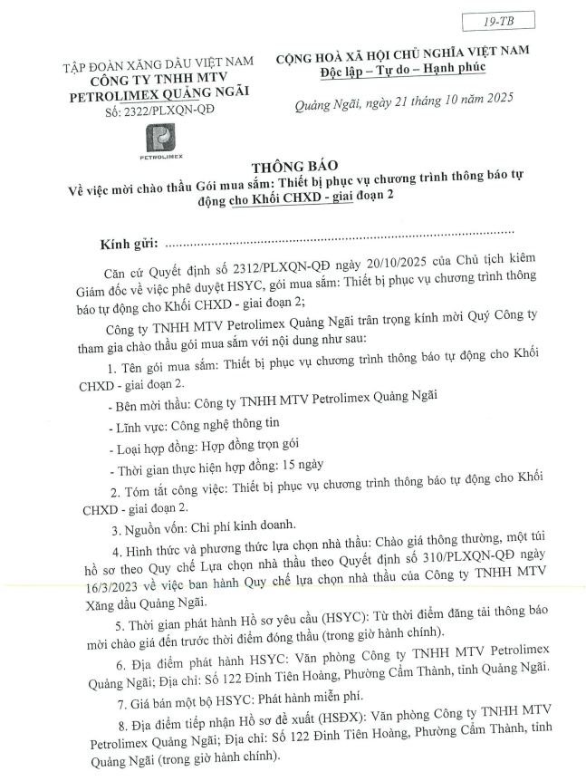 Thông báo Mời thầu gói mua sắm thiết bị phục vụ chương trình thông báo tự đồng cho khối CHXD - Giai đoạn 2