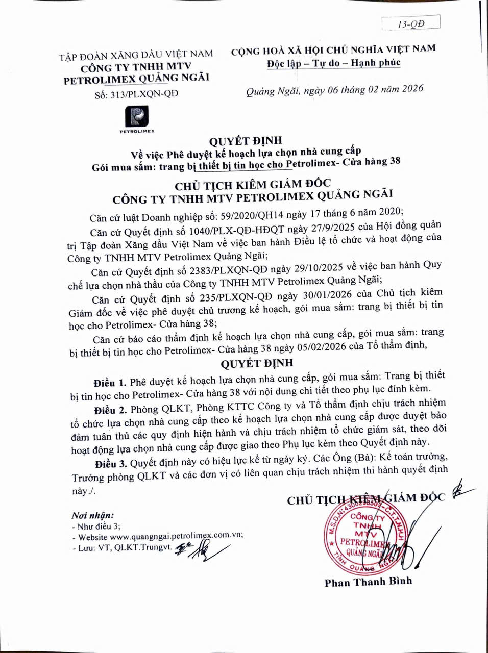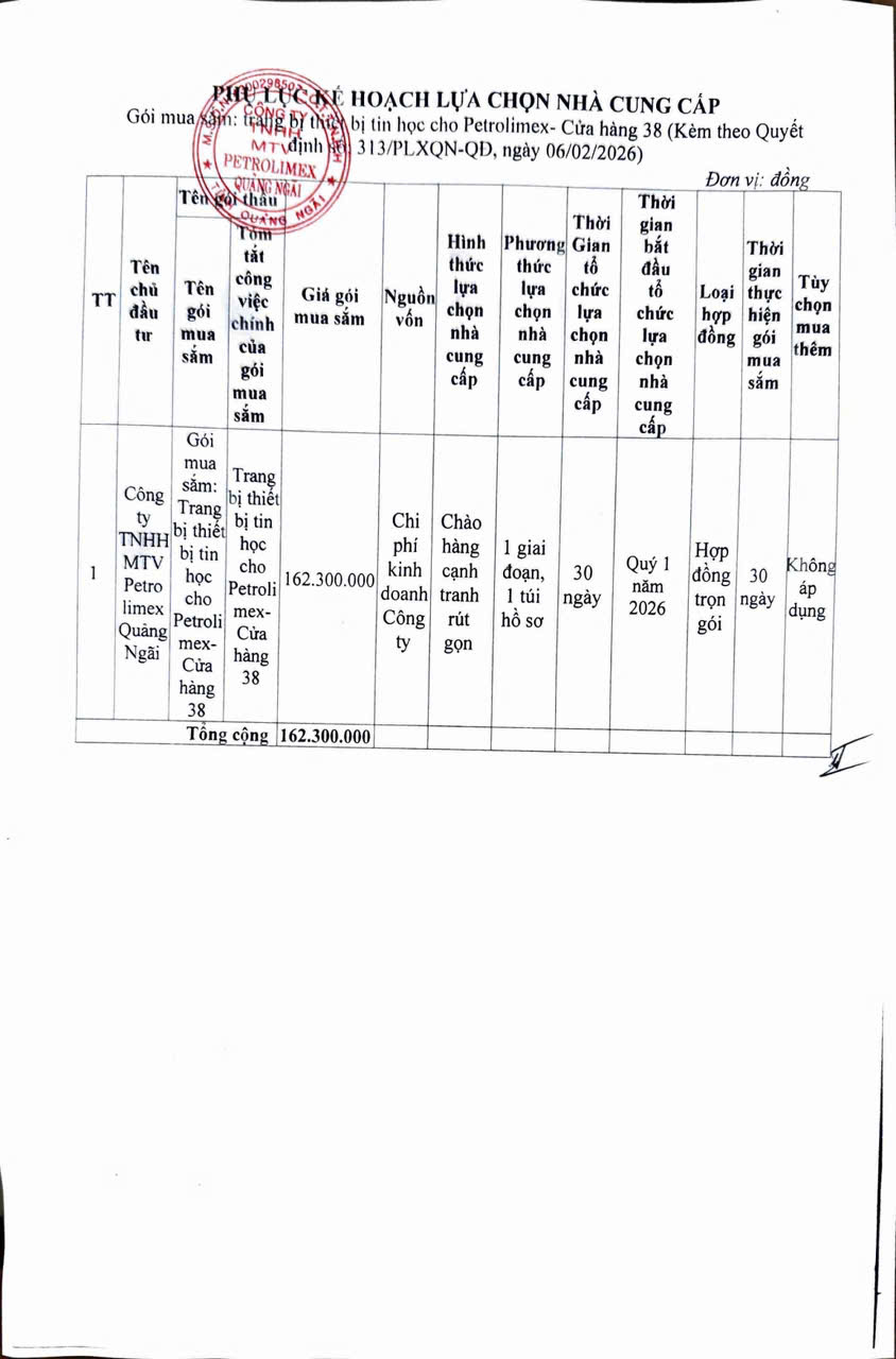 2026006.13-Quyết định phê duyệt kế hoạch lựa chọn nhà cung cấp Gói mua sắm: trang bị thiết bị tin học cho Petrolimex- Cửa hàng 38
