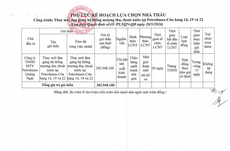 Quyết định phê duyệt kế hoạch lựa chọn nhà thầu thay mới đan gang hệ thống mương thu, thoát nước tại Petrolimex-Cửa hàng 14, 19 và 22