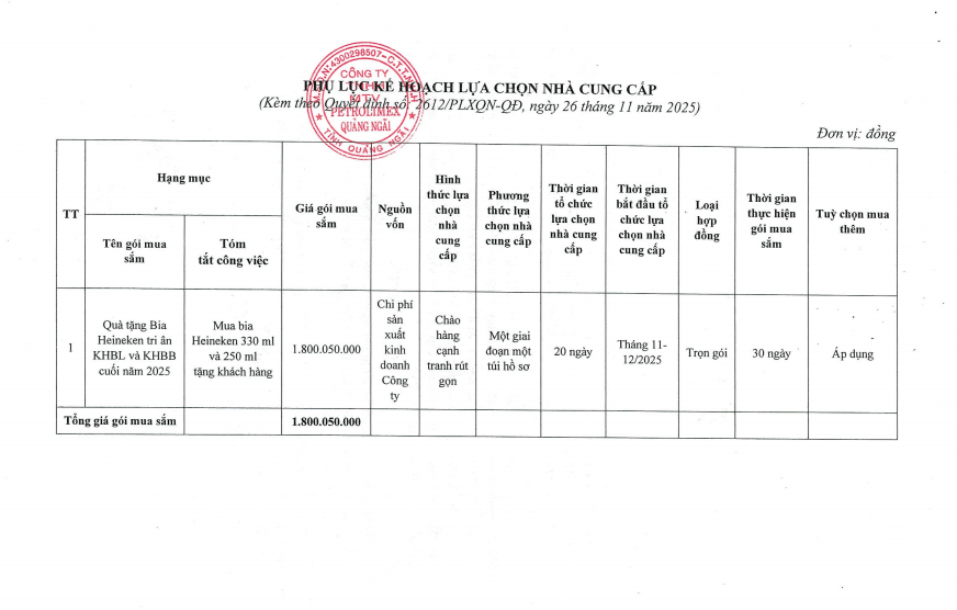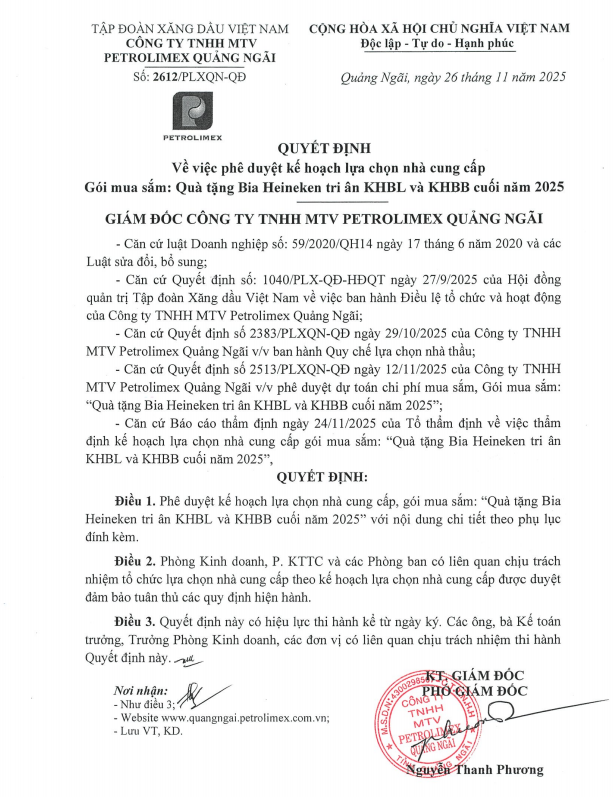 Quyết định phê duyệt kế hoạch lựa chọn nhà cung cấp Quà tặng Bia Heniken tri ân KHBL và KHBB cuối năm 2025