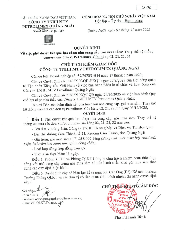Quyết định phê duyệt kết quả lựa chọn nhà cung cấp thay thế hệ thống camera tại các đơn vị Petrolimex-Cửa hàng 02, 21, 22, 32