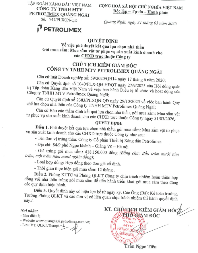 Nguồn: Phòng QLKTPetrolimex Quảng Ngãi