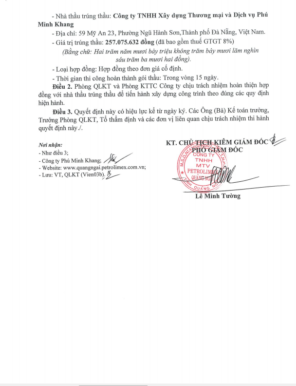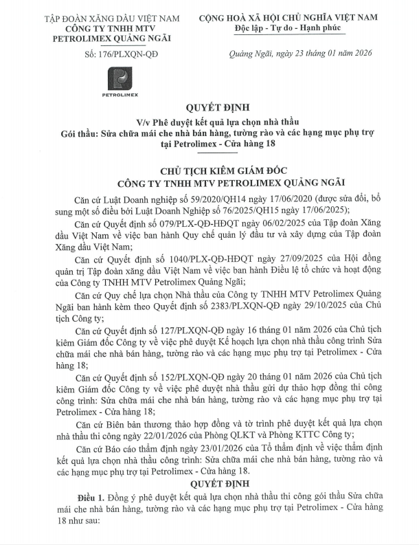 Quyết định phê duyệt kết quả lựa chọn nhà thầu sửa chữa mái che nhà bán hàng, tường rào và một số hạng mục tại phụ trợ tại Petrolimex-Cửa hàng 18